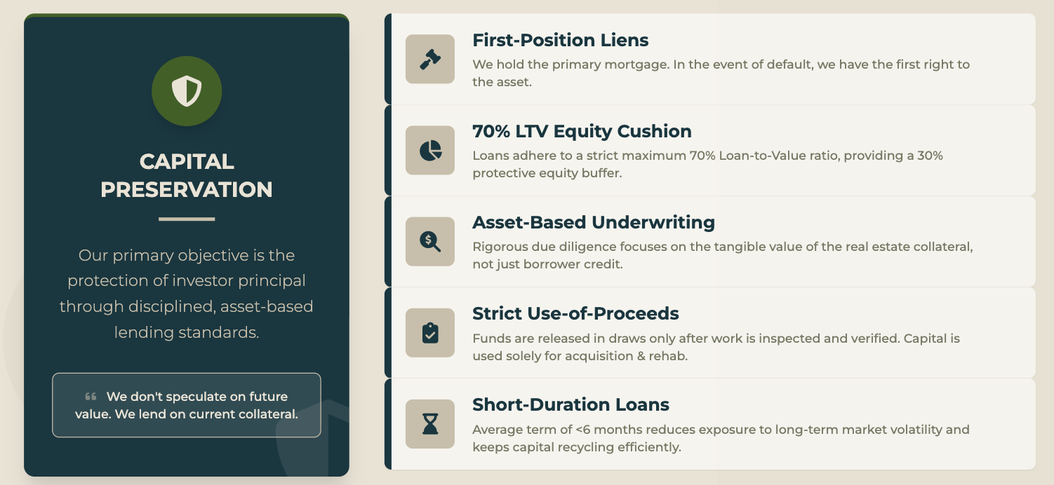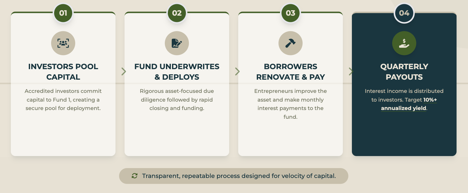 Investor Earnings: Interest from Short-term rehab loans, targeting 10%+ annualized yield with quarterly distributions.