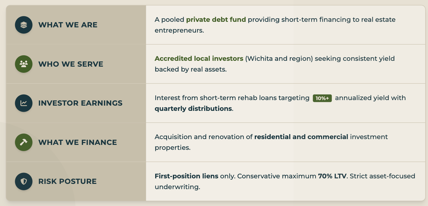 Our fund pools capital from local Wichita investors to provide short-term financing to real estate entrepreneurs who acquire and renovate residential and commercial properties throughout the community.